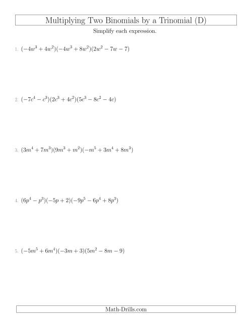 Multiplying a binomial by two trinomials (c) Multiplying a binomial by a trinomial (a) algebra worksheet Multiplying a binomial by two trinomials (g)